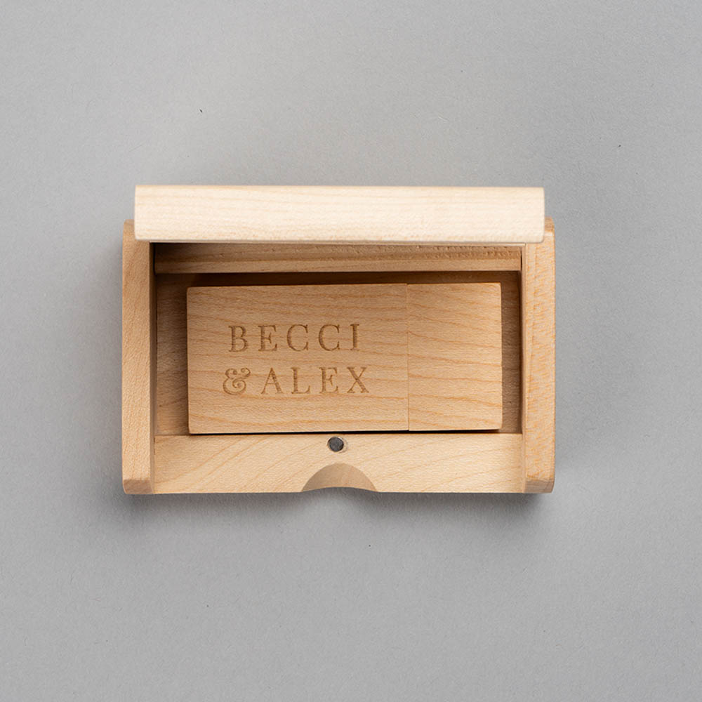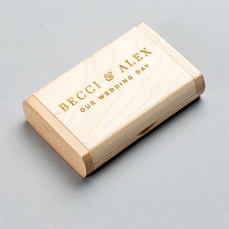 Flip Wooden USB boxes are available in maple wood with UV colour print & laser etching or in a rich dark walnut wood with laser etching.